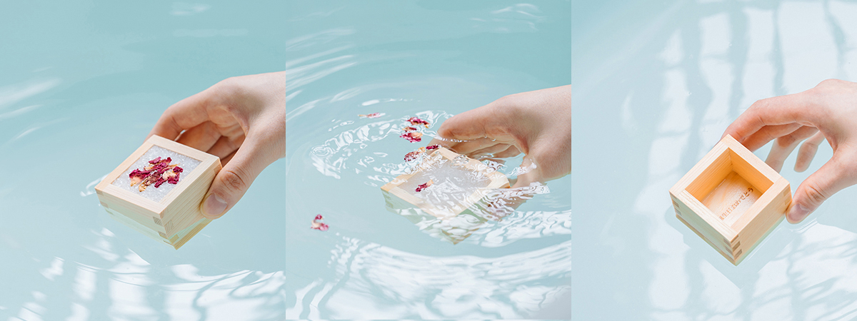 パッケージを取り除き、お風呂に浸かりながら枡ごとお湯に沈めるだけ。ソルトが溶け、ドライハーブとハーブの香りが浴槽を漂います。